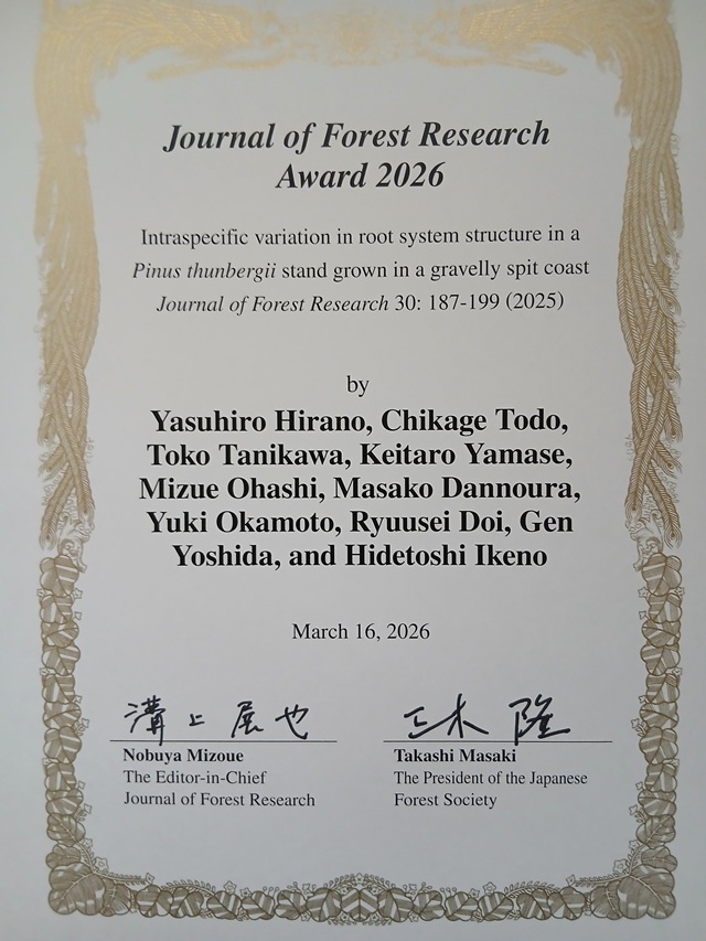 Journal of Forest Research論文賞は年間50本以上の国際英語論文から選ばれる最優秀論文である。本論文は、海岸林の樹木について大きな根系の3次元構造を維持したまま掘り取るという他に類を見ない方法のみならず、デジタル画像から3次元根系構造を復元し、土壌特性とともに構造と要因を解析するという手法を確立した点でオリジナリティが高く評価された。大きな根系を実験室に持ち帰り解析することは困難であったが、本手法によりデジタルデータ保存と再解析を可能とした点もモニタリングの視点から画期的である。著者らのデータを既存文献とともに、クロマツの根の最大深さは樹高から推定できることを示した点で、津波耐性など海岸林の減災機能を評価するという緊縛の課題に応用可能な点で評価が高い。以上の理由から本論文がJournal of Forest Research論文賞2026としてふさわしいとして表彰された。