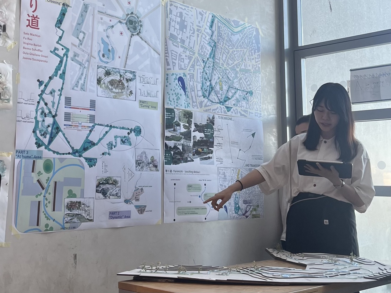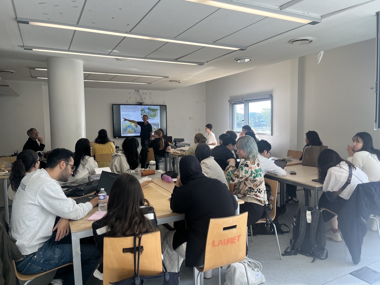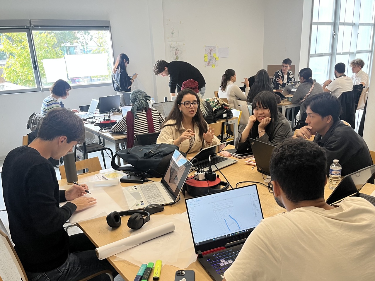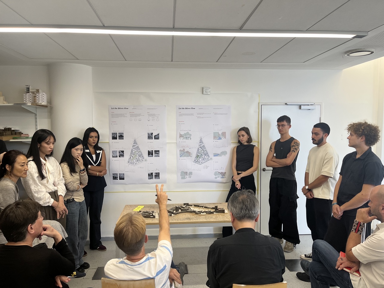 大学院環境学研究科都市環境学専攻建築学コースは、2025年9月15日(月)から19日(金)までの5日間、フランスのパリ・ヴァル・ドゥ・セーヌ国立高等建築学校(ENSAPVS)を主会場として、ENSAPVSと合同で国際学生建築・都市設計ワークショップを開催しました。「What if the Bièvre river were to flow once more through the heart of Paris」という今回の課題に、ENSAPVSの留学生22名と天津大学の学生4名、そして本学の建築学コース博士前期課程1年の後藤和也君、佐藤舞千代さん、山本蒼太君、渡辺早紀さんの4名が参加し、4つの混成チームに分かれて本課題に取り組みました。ENSAPVS参加学生22名は、スペイン、モロッコ、ドイツ、ポーランド、メキシコ、ブラジル、スイス、アメリカ、イタリア、オーストリアと多岐にわたる国籍を有しており、これまでになく国際性豊かなワークショップとなりました。本WSの指導はENSAPVSのBoris Weliachew教授、天津大学の鄭穎副教授と本学の小松尚教授、項一朗助教が行いました。