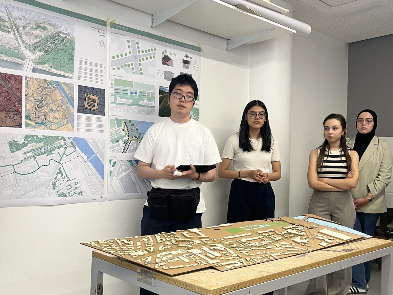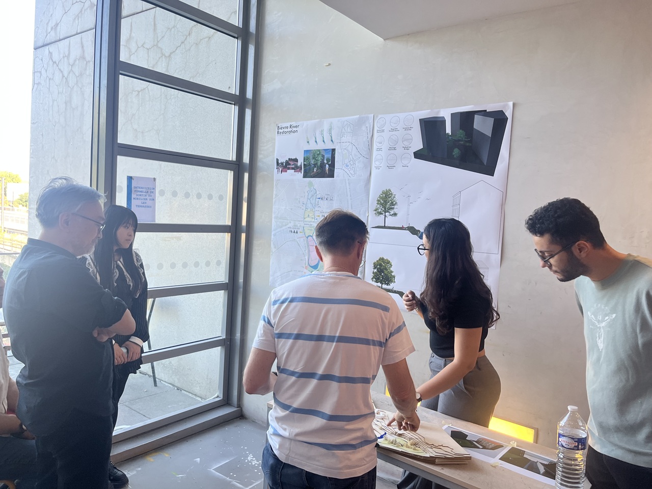 5日目の夕方には、成果発表会を行いました。発表には、担当教員だけでなく、ENSAPVSのPatrice CECCARINIJ教授、Jérémie BEDEL教授も出席しました。各チームが分析結果と提案内容を図面(A0判2枚)と模型で発表し、講評では、4つのチームからの提案に対して、ビエーヴル川の再生によって、現代都市において関わってきた自然空間、親水空間、歴史的記憶が、いかに創造的な方法で実現されるかを考察しました。さらに、先生方が各グループに対して、個別のフィードバックを行い、活発な議論が交わされ、会場は大いに盛り上がりました。5日間という短期間の中で、各チームはビエーヴル川の再生計画に取り組み、それぞれが独自のコンセプトを掲げ、川の有機的な形態や自然環境を都市空間に取り込む提案を行いました。